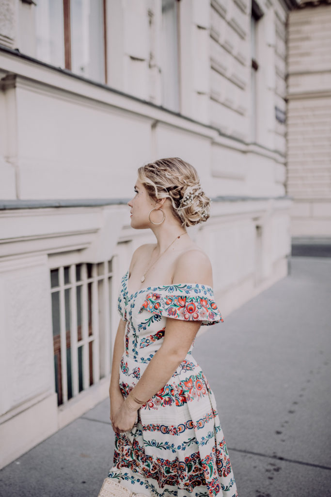 Als ich dann aber eines Abends durch meinen Instagram Feed gescrollt bin und über ein Bild von Lena Hoschek stolperte, war mir klar, wie das perfekte Life Ball Outfit für mich aussehen würde: ein Kleid aus der Kiss me Piroschka Kollektion von Lena Hoschek. Ein bisschen Folklore, ein bisschen Heimat und ganz viel Weiblichkeit – die perfekte Mischung für den Life Ball ❤ Schnell hatte ich mich auch für ein Kleid entschieden: Das Ilona Dress in Creme (Ich trage übrigens Größe S). Es hat mir nicht nur aus der Kollektion am besten gefallen, sondern passte auch beim Reinschlüpfen wie angegossen. Ich glaube, man sieht aber auch an den Fotos, wie wohl ich mich darin gefühlt hab‘. Lena Hoschek weiß einfach, wie sie uns Frauen mit ihren Designs am schönsten aussehen lässt und unsere Vorzüge perfekt in Szene setzt. Wusstet ihr, dass die Designerin nicht nur die Entwürfe für Kleider und Co. selbst entwickelt, sondern auch ihre eigenen Muster und Stoffe kreiert? Kein Wunder, dass ihre Schöpfungen was Farben, Muster und Schnitte betrifft so wunderbar harmonieren.