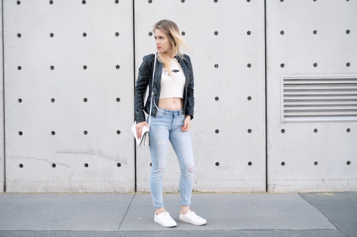 Mein Lieben, am Wochenende war’s mal wieder so wunderschön, dass man sich ja schon fast sommerlich anziehen konnte. Da hab‘ ich mich für eine Easy Kombination entschieden: Mein Lieblings Crop Top (ein Geschenk von meinem BF ♡), meine Ripped Jeans von H&M und eine schwarze Lederjacke. Mit dem Crop Top verbindet mich ja so eine Art Hass-Liebe. Ich finde die Tops wirklich mega stylisch und sie sind meiner Meinung nach ein Must Have in jedem Kleiderschrank, aber trotzdem man braucht an Tagen an denen man sie trägt diese Extraportion Selbstbewusstsein und die hab‘ ich hald auch nicht immer. Ihr versteht mich oder?